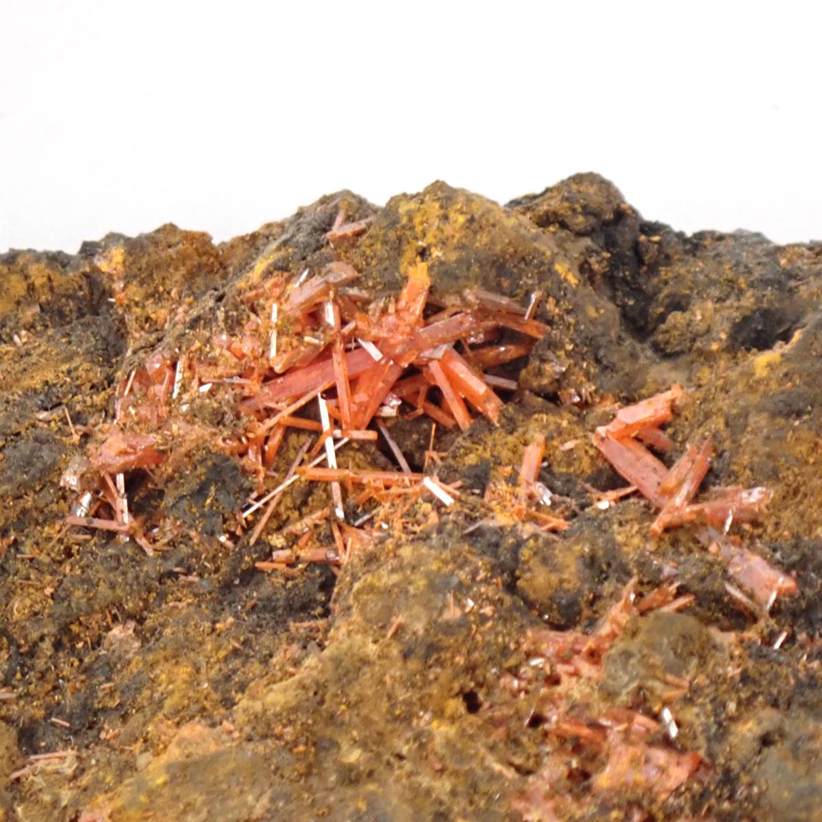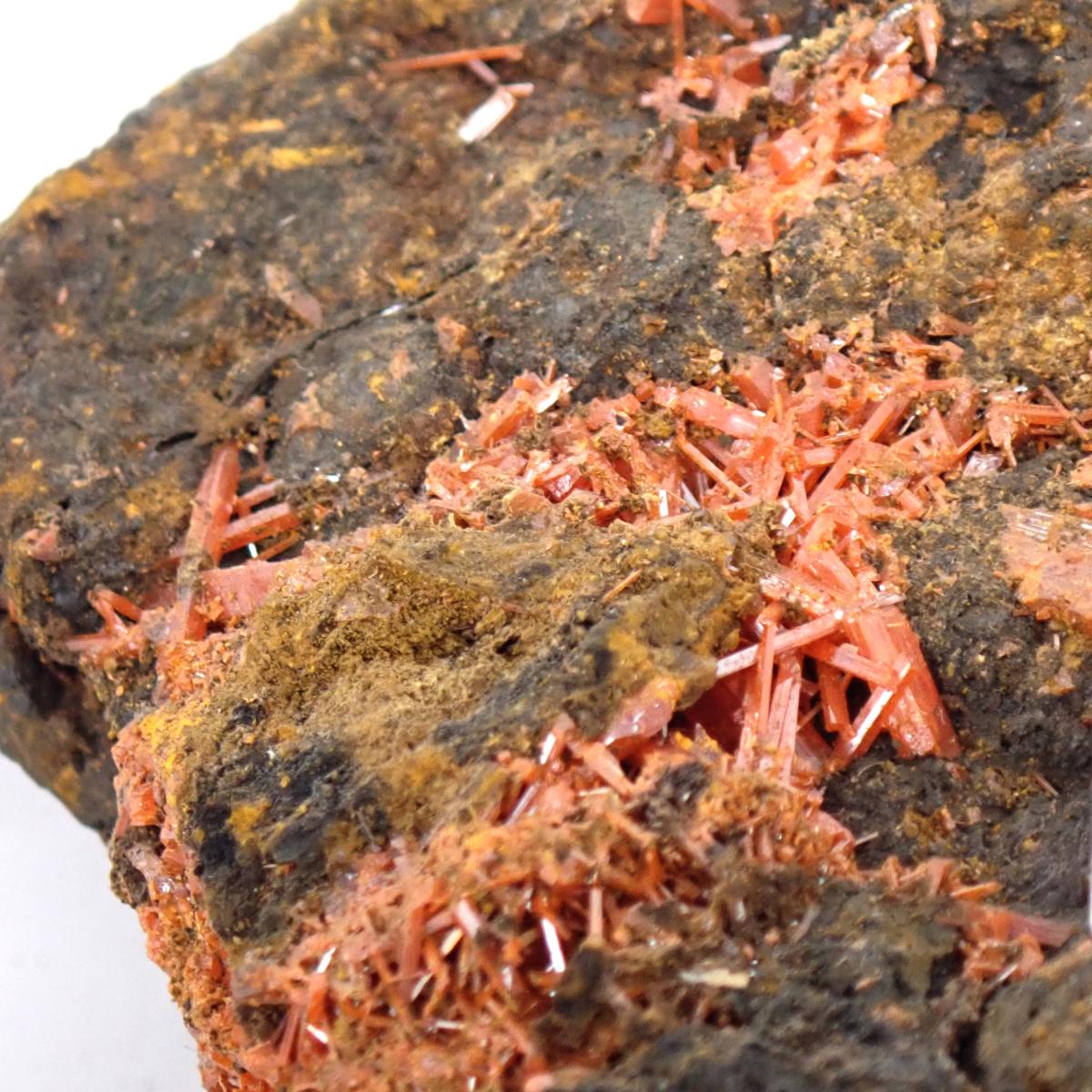 Cristallisant en prismes allongés souvent translucides à transparents, la crocoïte présente un éclat adamantin à vitreux. Ses cristaux peuvent atteindre plusieurs centimètres, parfois plus de 10 cm pour les plus beaux spécimens. Elle se forme principalement dans les zones d’altération des gisements de plomb, ce qui explique sa rareté et la valeur élevée des pièces de qualité.