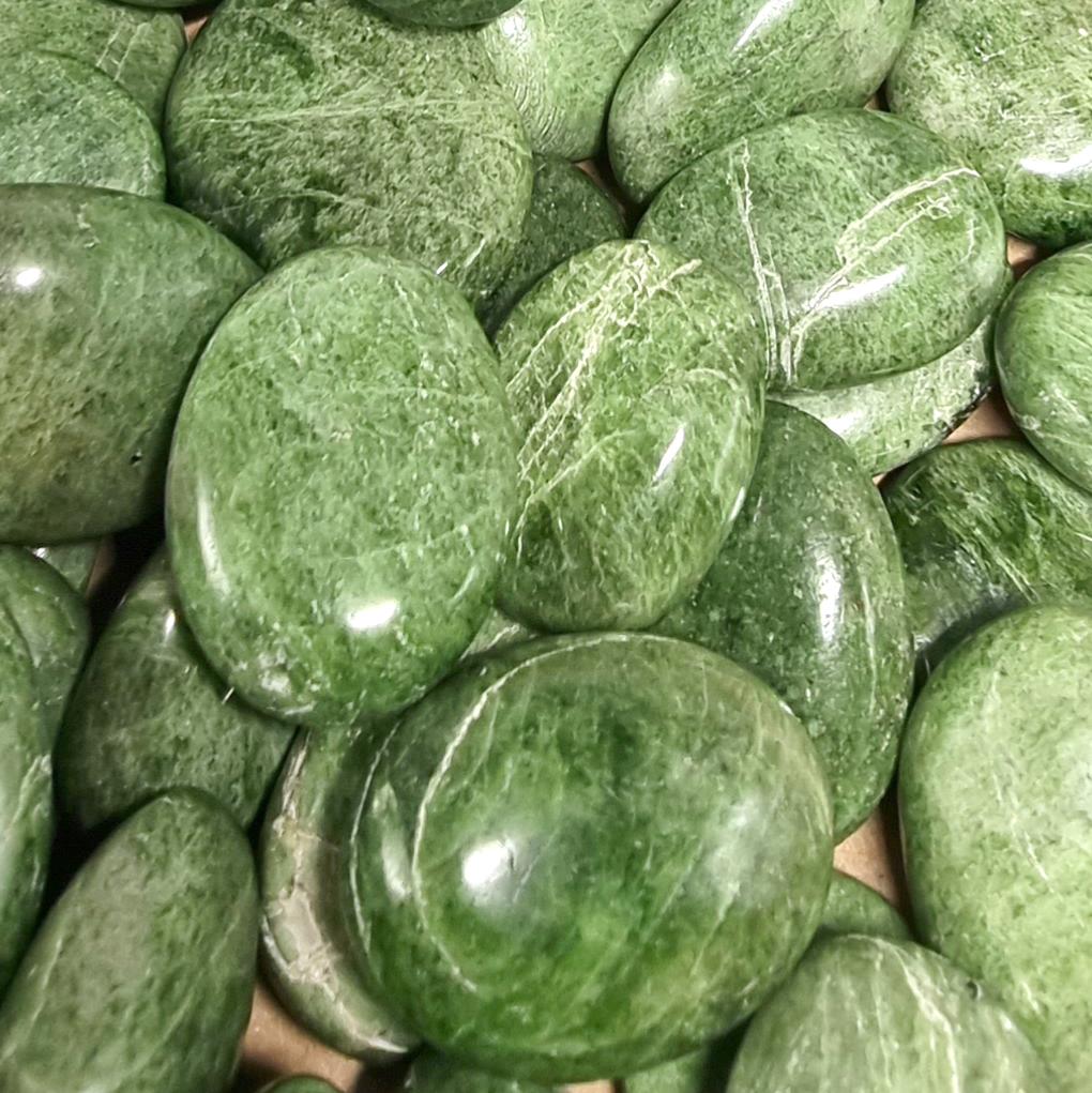 Silicate de calcium et de magnésium, de la famille des pyroxènes (Ca Mg Si2 O6). Action apaisante du chakra du cœur. Sur le plan psychique elle apporte du réconfort. Elle est conseillée pour nous accompagner dans la peine et pour guérir les chagrins d'amour.