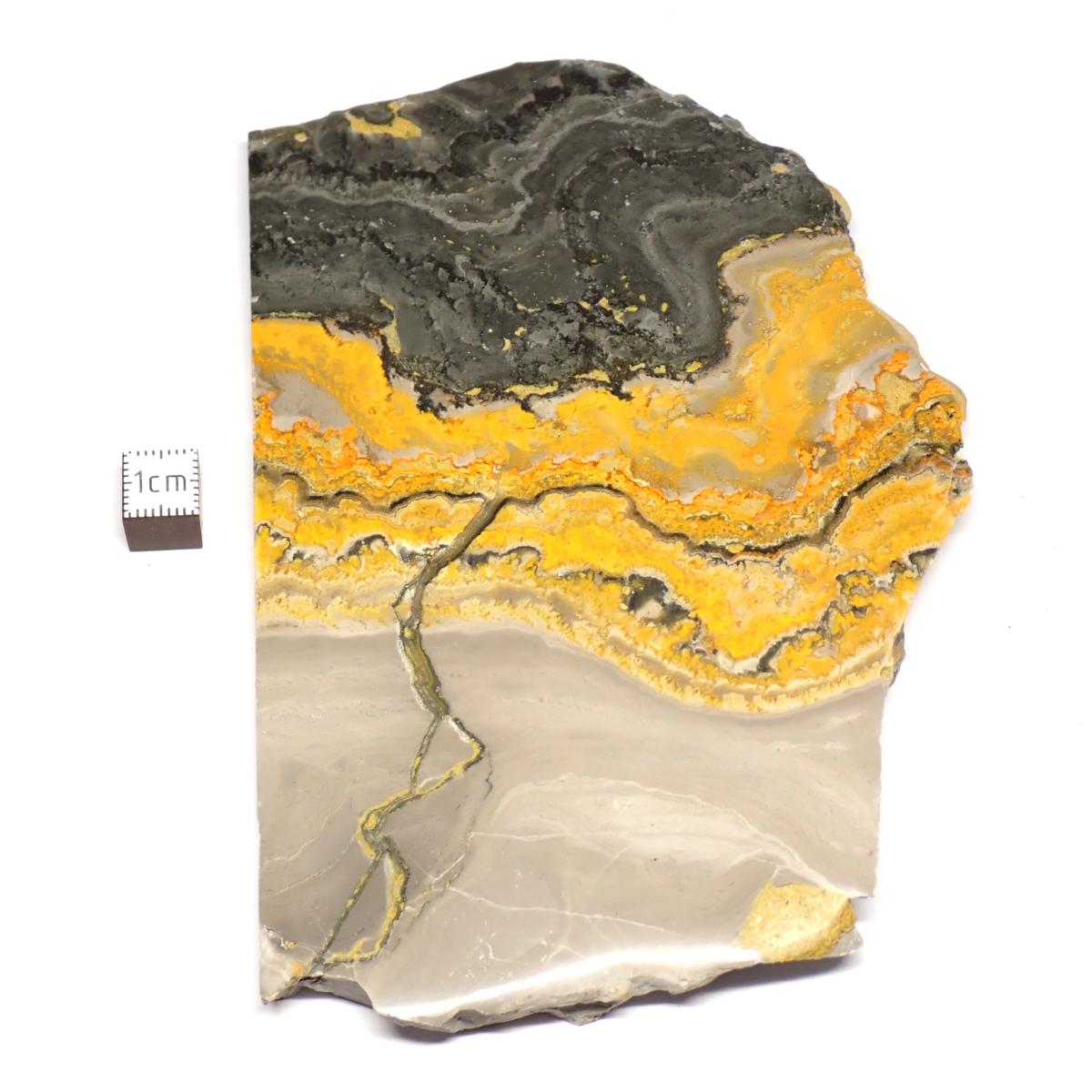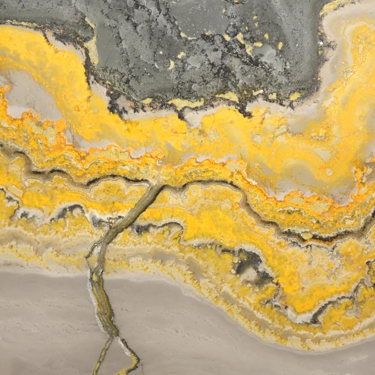 Le jaspe abeille, aussi appelé jaspe bourdon (Bumblebee Jasper), provient des zones volcaniques de l’île de Java, en Indonésie, notamment des pentes du volcan Ciremai. Sa spectaculaire couleur jaune, orange et noire est due à la présence de soufre, d’arsenic (réalgar) et de pyrite. Contrairement à son nom commercial, il ne s’agit pas d’un véritable jaspe : cette pierre ne contient aucun quartz, mais est composée principalement de calcite fibreuse à croissance radiale.