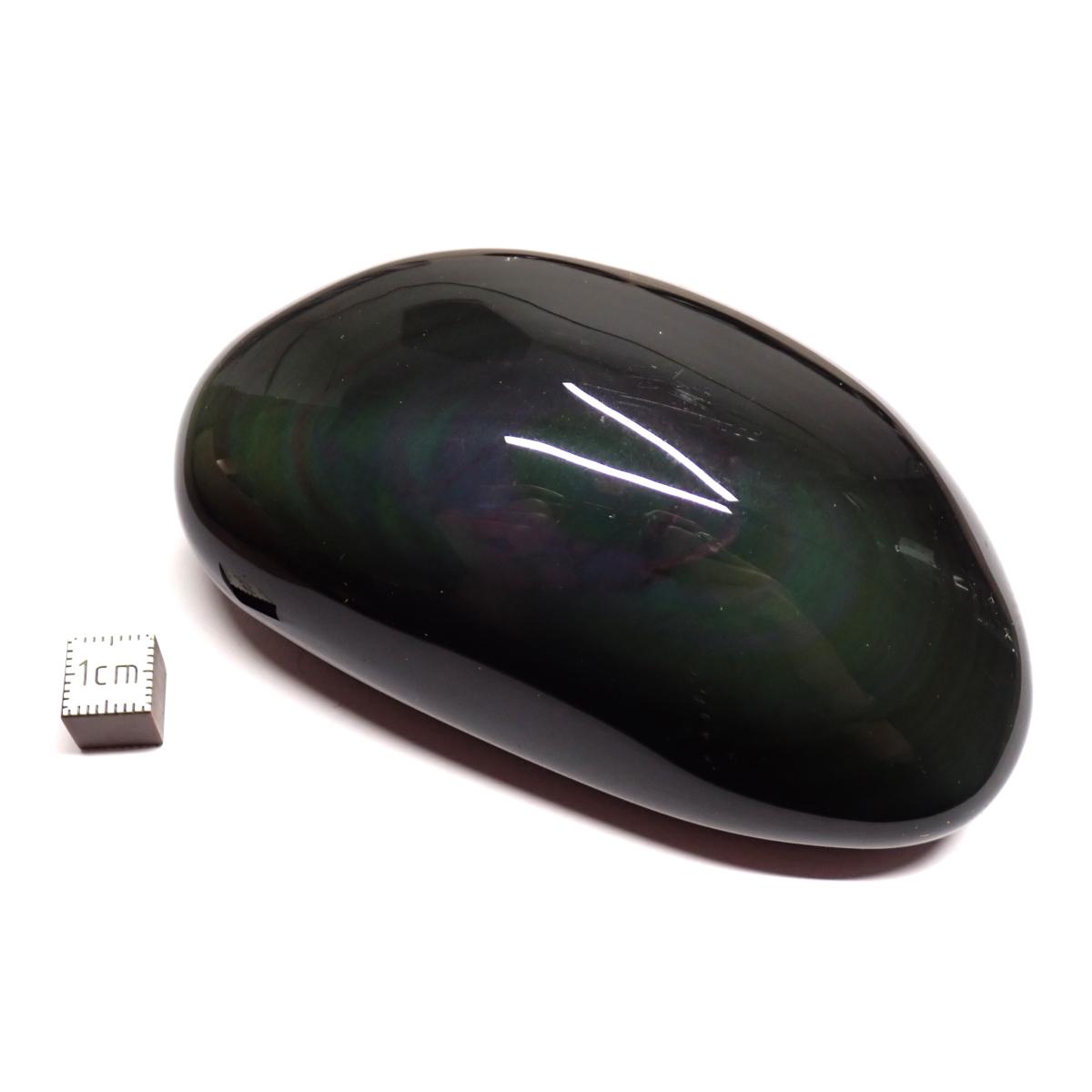 L’obsidienne œil céleste, aussi appelée obsidienne arc-en-ciel, est un verre volcanique naturel présentant de magnifiques reflets irisés concentriques, parfois violacés ou multicolores. Originaire principalement du Mexique, elle se forme à partir de lave en fusion refroidie rapidement. Ses irisations sont dues à des inclusions microscopiques (notamment des nanocristaux orientés) qui diffractent la lumière, créant cet effet lumineux unique.
