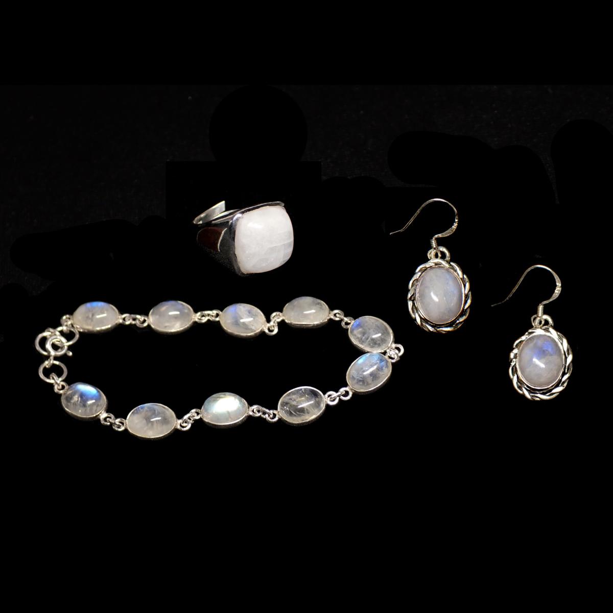 Parure de bijoux en argent sertie de pierre de lune bleutée. Cette ensemble est composé de une bague, un bracelet et une paires de boucle d'oreille.