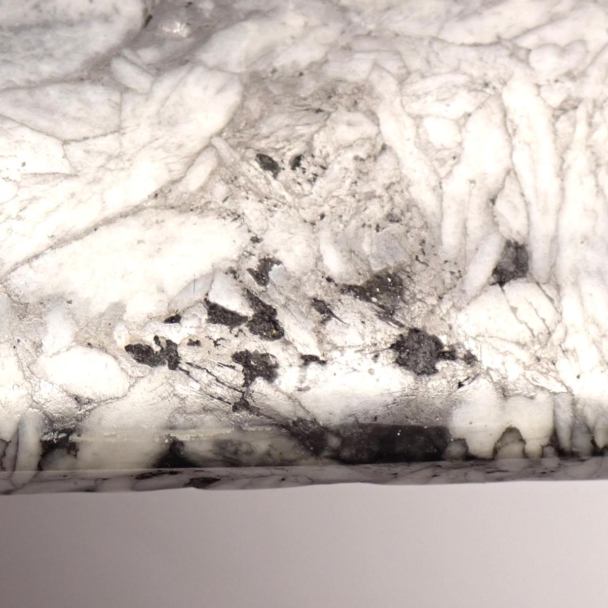 La pinolite est une pierre naturelle originaire principalement d’Autriche, composée de dolomite gris foncé à noire pigmentée de graphite, avec des inclusions blanches de magnésite évoquant des pignons de pin (d’où son nom, issu de l’italien pinoli). Cette association unique de magnésium et carbone-graphite lui confère une énergie à la fois apaisante, ancrante et clarifiante.